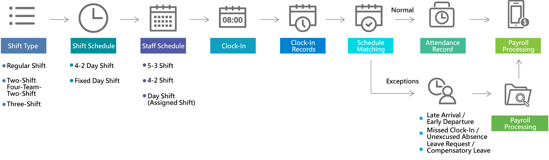 HR staff can define custom data formats for time-clock imports. Even if the company later replaces time-clock devices, no vendor assistance or system modification is required. After time-clock data is imported, the system automatically compares it with shift schedules and generates attendance exception reports.