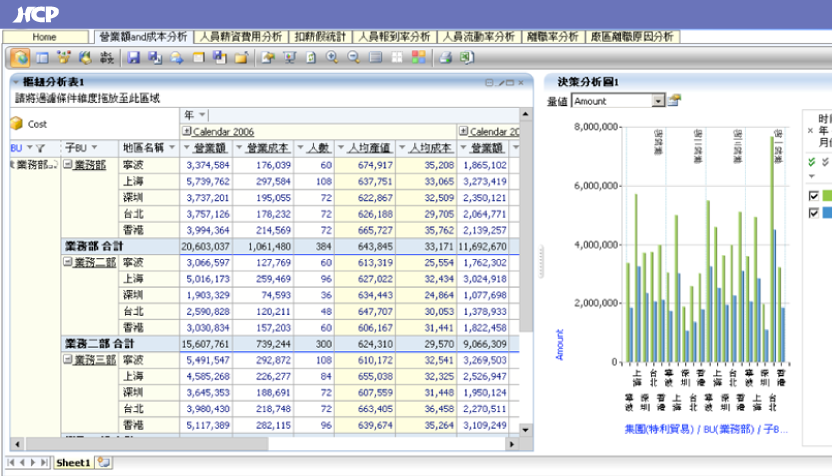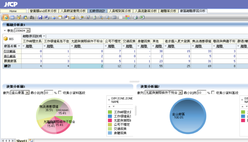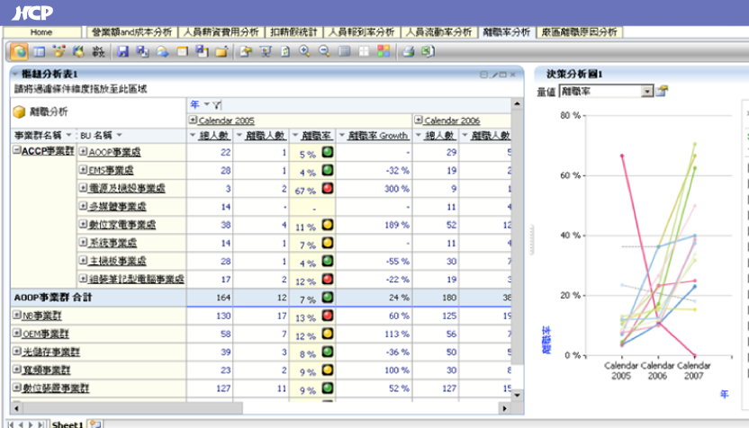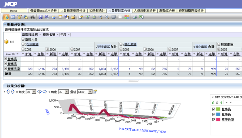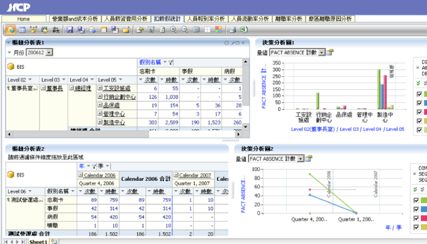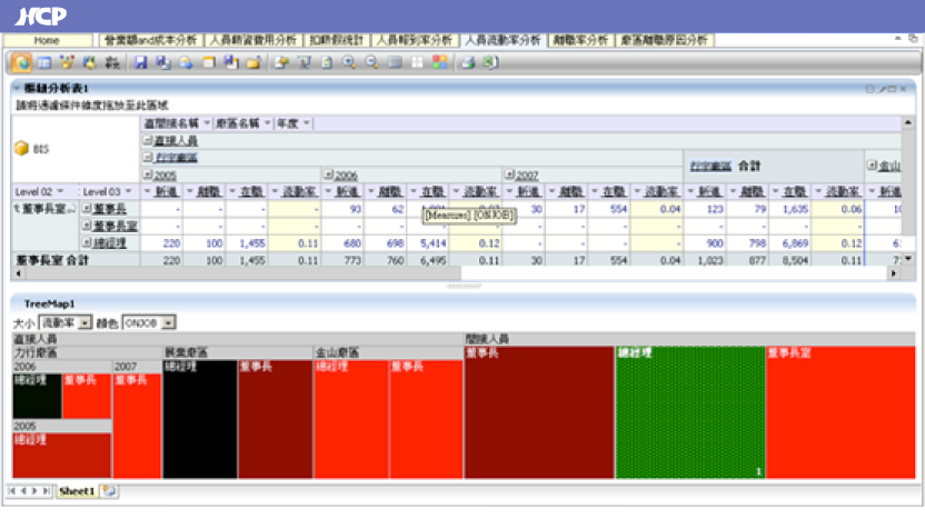HCP integrates with Analyzer business intelligence software to deliver a Business Intelligence System (BIS) designed specifically for HR teams. With 25 dimensions and 20 measures, users can freely drag and combine multidimensional analytical reports, supported by a wide range of visual analytics tools. Reports can be generated in as little as 30 seconds and are accessible on mobile devices, enabling HR and IT teams to produce insights effortlessly.