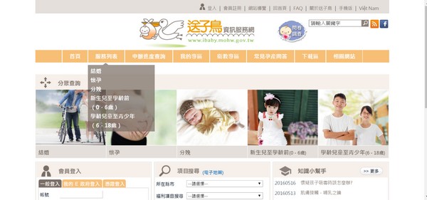 送子鳥資訊服務網係規劃建置便利民眾的一站式貼心服務,提供民眾自結婚、懷孕、分娩、新生兒至學齡前、學齡兒童至青少年各階段所需要的福利項目及衛教資訊,協助新手爸媽解決遇到的問題,彙集各縣市政府提供的服務項目,利用電子地圖的快速查詢方式,讓民眾可以直接針對所在的縣市查詢補助辦法,掌握自己可以申請的條件、額度、時程等相關權益。除提供福利項目及詳細衛教資訊內容外,民眾只要加入送子鳥會員,填寫預產期或是新生兒出生日期等資訊,該系統會主動並提前發送「產檢通知」、「新生兒預防接種」,透過電子報訂閱專屬訊息,即可收到「新生兒健保卡申辦進度查詢」、「勞保或國民年金生育給付進度查詢」之通知服務;另為擴大服務新住民,該網站新增越南語版網頁,提供越南新住民更貼心的便利的服務。